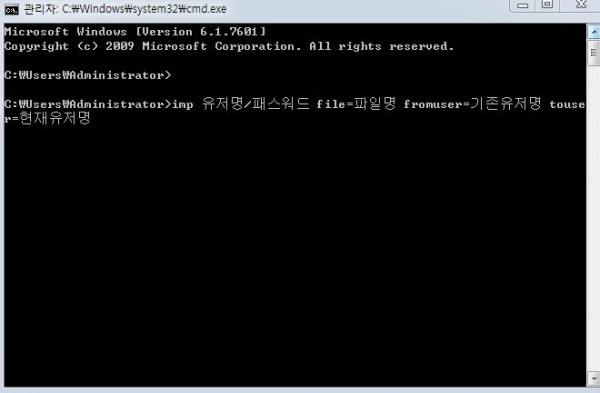 이런식으로 imp 현재유저명 / 패스워드 file=파일명 만 적어도 imp가 됩니다.