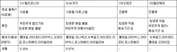 오레곤과 델라웨어의 배송대행지는 0% 세일즈 택스를 위해서 배송대행사가 오픈 하는 경우가 많아요~